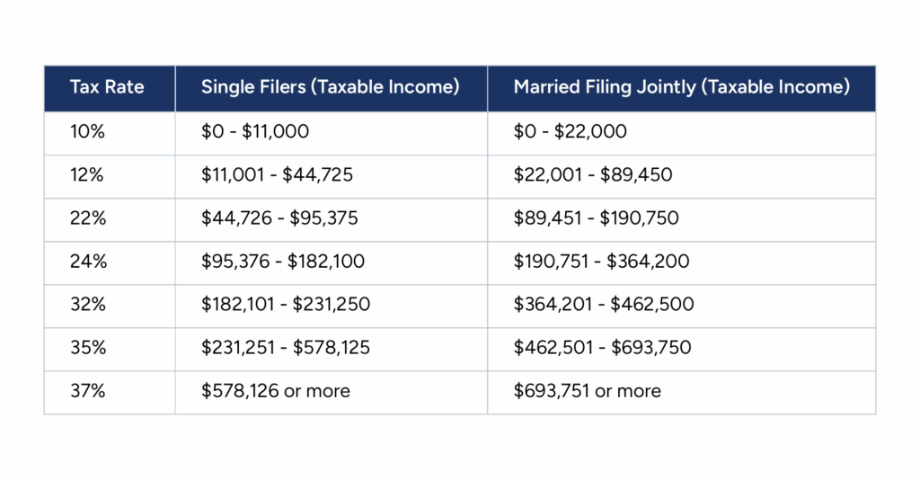 The U.S. federal income tax system follows a progressive structure, meaning the rate increases as taxable income grows. Below are the federal tax brackets for the 2025 tax year for both single filers and married couples filing jointly. Keep in mind that these brackets and rates can change, and certain deductions or credits may alter your effective bracket.